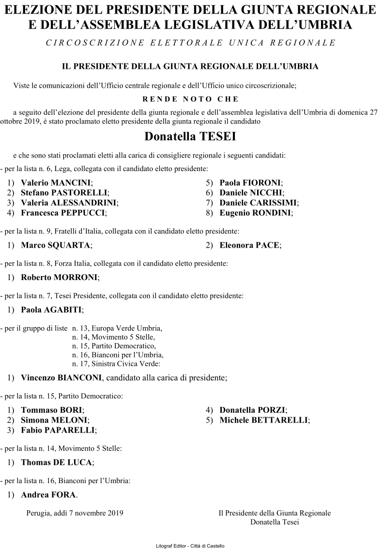 - sono convocati per domenica 27 ottobre 2019 i comizi elettorali per l’elezione del Presidente della Giunta regionale e dell’Assemblea legislativa dell’Umbria;